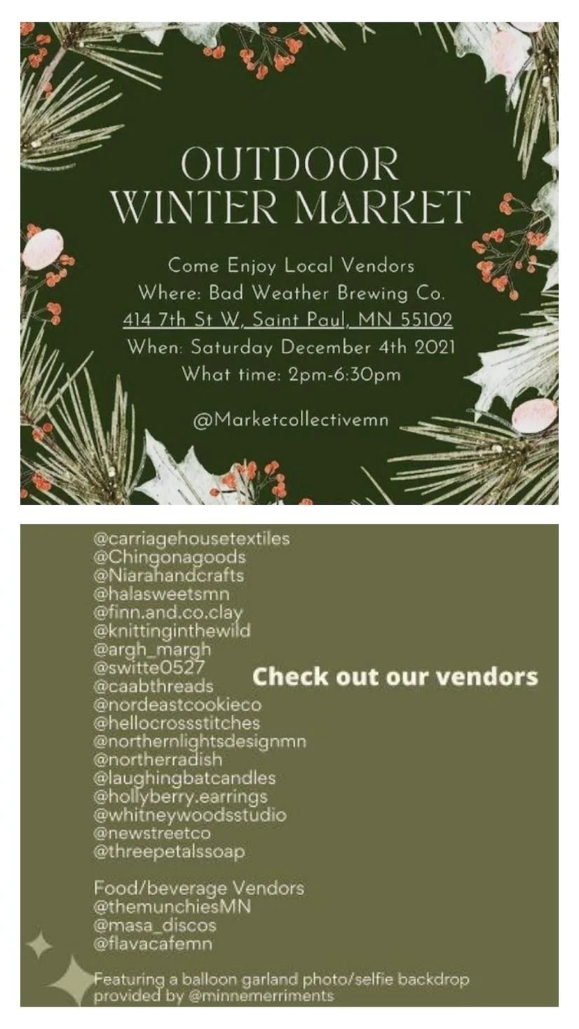 Outdoor Winter Market Saturday, December 4, 2021 2:00 PM 6:30 PM 14:00 18:30 Bad Weather Brewing Company 414 7th St W St Paul, MN, 55102 United States (map) Google Calendar ICS Out on our extended patio w/ fire pits, beer and lots of local vendors View fullsize View fullsize View fullsize View fullsize View fullsize View fullsize View fullsize View fullsize View fullsize View fullsize View fullsize View fullsize View fullsize View fullsize View fullsize View fullsize