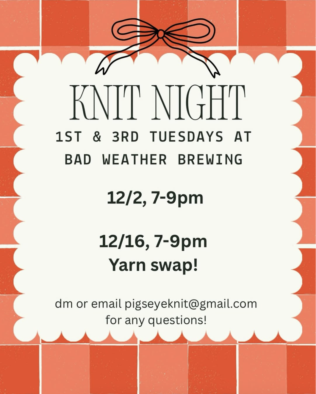 We meet on the 1st and 3rd Tuesdays 7-9pm at @badweatherbrew, our December dates are 12/2 and 12/16, with a YARN SWAP on 12/16! All skill levels welcome, crochet/weaving/spinning/etc also welcome!