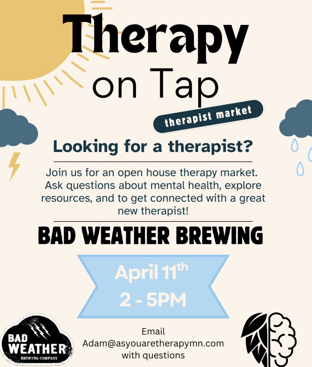 Therapist from the Twin Cities area will be at Bad Weather Brewing to answer questions, talk, and help you find the right fit.